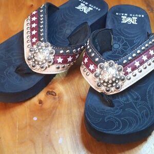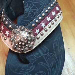 Stylish flip flops with star and stud accents. Features a bold silver embellishment. size 8/9