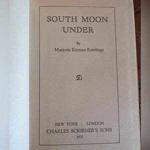 This historical novel, titled "South Moon Under" by Marjorie Kinnan Rawlings, is a rare find for any book collector. Published in 1933 by Charles Scribner's Sons, this hardcover edition is the first print and is in great shape. The book is personalized and has no inscriptions or ex libris. It is a great addition to any collection and is a must-read for fans of historical novels. The book is in English and was written in the 1930s. It covers an interesting topic and is perfect for anyone interested in historical literature.