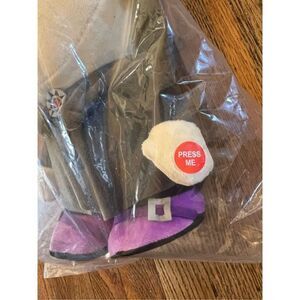 Has battery pack in back under shirt w/velcro closure. Press his left hand and he says several phrases.