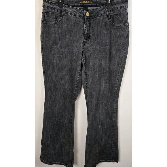 These South Pole Jeans in size 18 for women plus feature a medium back wash with a mid-rise and a 5-pocket design. The jeans have a flared style with a charcoal wash denim fabric, making them suitable for all seasons. The zipper closure, belt loops, and polyester-spandex blend provide comfort and durability. The black color and various themed accents like grunge, punk, and rock add a unique style to these jeans, perfect for those looking for a bold and edgy fashion statement.