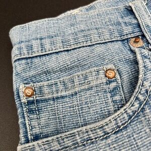 These jean shorts feature a light wash with a distressed finish, offering a relaxed and casual vibe. The cut-off style is complemented by a rolled hem, making them ideal for warm weather outings. Their pale blue hue adds a touch of classic denim charm to any outfit. These are preowned with no known defects.