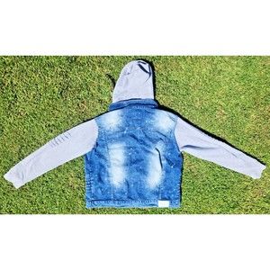 South Pole Men’s Paint Splash Blue Denim & Gray Removable Hoodie Jacket Size L