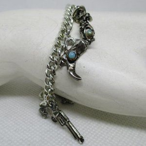 Never Worn vintage southwestern charm bracelets, silver-tone metal turquoise cabochon charms. Charms include turquoise cabochon tomahawk charm, turquoise cabochon skull charm, turquoise cabochon donkey charm, turquoise cabochon cowboy charm, turquoise cabochon cowboy boot charm, and pistol charm.