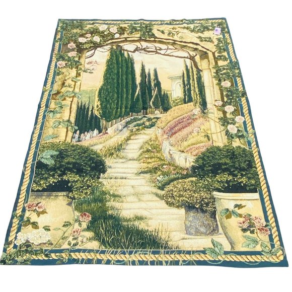 Step beneath the stone archway adorned with trailing vine roses, and bask in the gentle embrace of sunbeams filtering through the cypress trees as you leisurely explore the landscapes of the South of France. This exquisite and sizable tapestry wall hanging is aptly named "South of France," capturing the essence of this enchanting region.