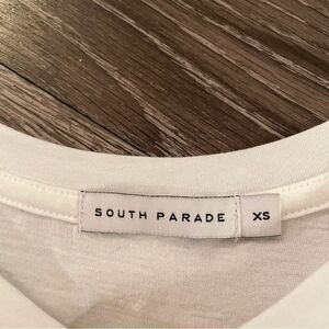 Gently worn in excellent condition. White with red writing. Measurements posted in photos