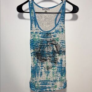 Vibrant tank top with blue and green abstract design. Ideal for casual wear.