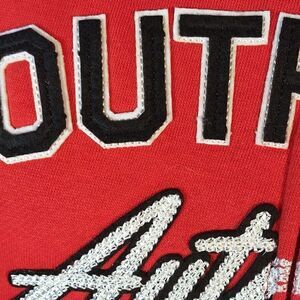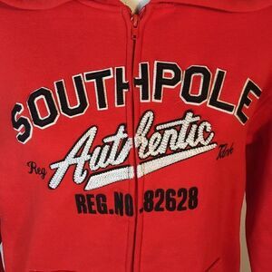 This New with tags red full zip South Pole varsity hoodie is a junior size Medium with a pit to pit measuring 21". It has two front hoodie pockets. 60% cotton 40% polyester and machine washable. All offers are welcome.