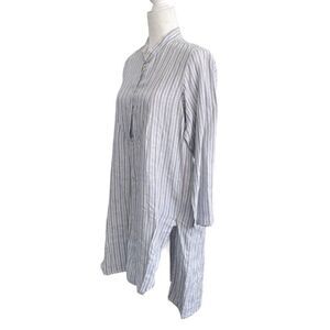 Vertical blue, gray, and white striped popover tunic with buttons down the chest. South Street SOST Linen from Portland, Maine. Approximately 33” long in front and 39” long in back.