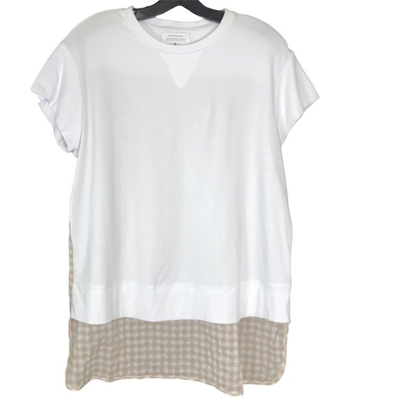 Southcott Threads Magnolia White Khaki Checkered Tee Shirt High Low Top MEDIUM