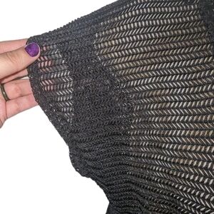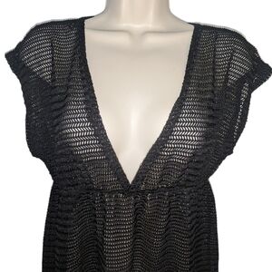 This cover up is in gently used condition. It is a lightweight stretchy mesh material. It has a v neck and a fitted elastic waist.