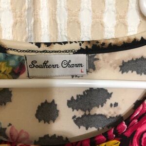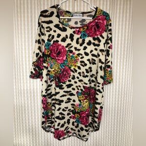 Stylish top with vibrant floral and leopard print. Features pink, cream, and black colors.