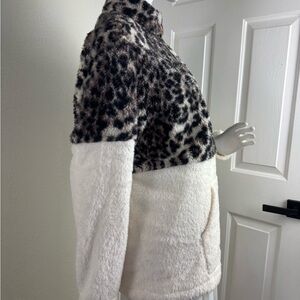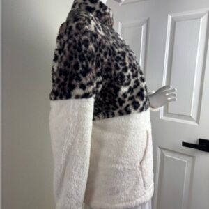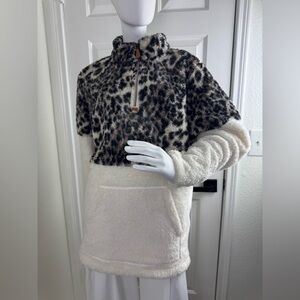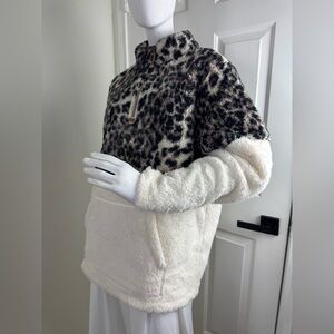 Stylish pullover with leopard print and white fleece. Perfect for a cozy look.