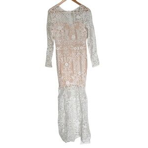 This gorgeous dress features a mesh overlay that features floral and geometric embroidered motifs that looks like a bold lace. The lining underneath is described by the brand as a neutral color, and it creates a sweetheart neckline under the lace. The lining ends above the knee. The lace overlay has a high neckline and low back and long sleeves. There is a hidden back zipper. The hem of the dress has a gentle scalloped edge. The cut of the dress is fitted in the bodice with a mermaid or trumpet waistline that is dropped and flares out.
