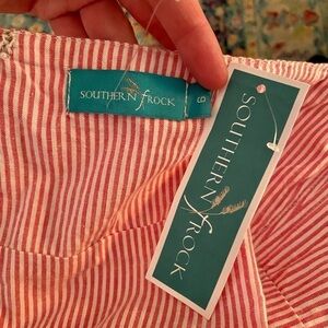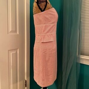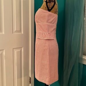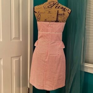NWT: New with Tags, Southern Frock Pink and White Seersucker Annabelle Strapless Peplum Dress. Size 6. 100% Cotton. Back Zip, Front and Side Boning for Structure.