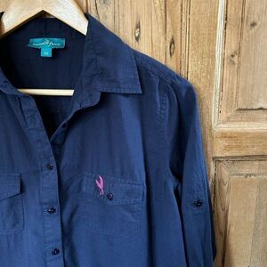 Features: Very cute basic blouse. Slightly longer length / could be worn as a tunic. Full length long sleeves. Buttons half way down the front. Two small chest pockets. Embroidered logo at the chest. Collared.