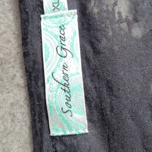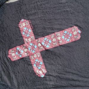 Southern Grace black lace sleeved jersey style top. Front adorned with burgundy cross with turquoise, tan, and black with silver glitter/metallic outline.