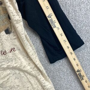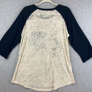 "All Bets are Off When the Tailgate Goes Down" Soft, lightweight graphic tee in semi sheer burnout. Contrasting, raglan style sleeves are 3/4 length.