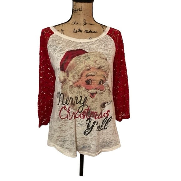 Super cute, it says merry Christmas y’all, has a knitting sleeves, and it would require a under garment because it is semi see-through.