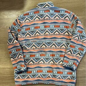 Cozy fleece pullover with a multicolor geometric pattern. Features a half-zip design for easy wear.