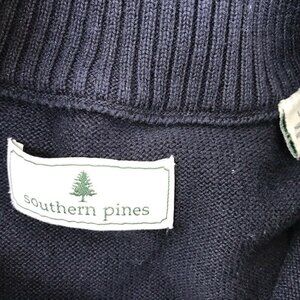 Men’s Southern Pines navy blue cotton zip vest with side pockets and brown leather trim. Size large in great shape. Armpit to armpit measures 22”, shoulder to hem 27”.