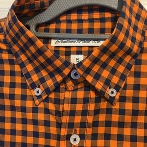 Long sleeve, Orange and blue check button down shirt. 100% cotton. Excellent condition