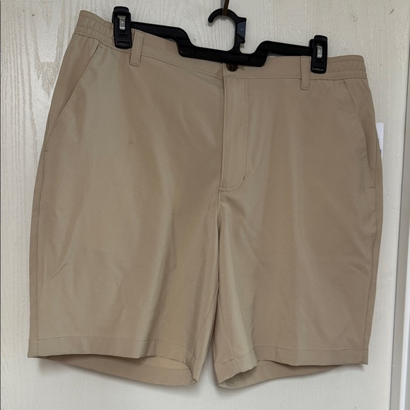 Stylish khaki shorts with a sleek flat front. Perfect for casual outings.