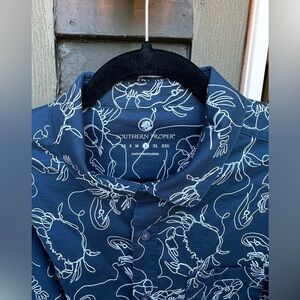 Southern Proper Mens Blue and White Short Sleeve Crab Button Down Size Large
