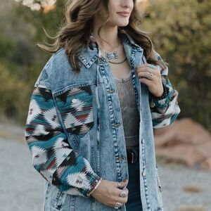 Embrace effortless style with the Southern Roots Denim Shacket, featuring a striking Aztec print on the sleeves, hood, and pockets for a distinctive look. Crafted from durable denim, this shacket offers both comfort and rugged charm. The detachable hood adds versatile wear options, allowing you to adapt to changing weather while maintaining a fashionable edge. Perfect for layering, it blends classic denim toughness with bold, authentic patterns for standout casual wear. Elevate your wardrobe with this unique piece that balances tradition and trend seamlessly.