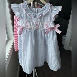 Southern Smocked Co Embroidered Cottontail Bunny Dress Pink/Aqua Seersucker 5Y