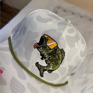 One of a kind white camo hat with bass detail . Has not been worn , zero wear or tear. Clearly still Snow White. These are made once