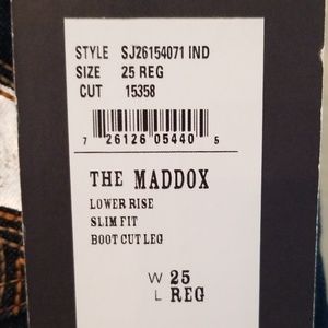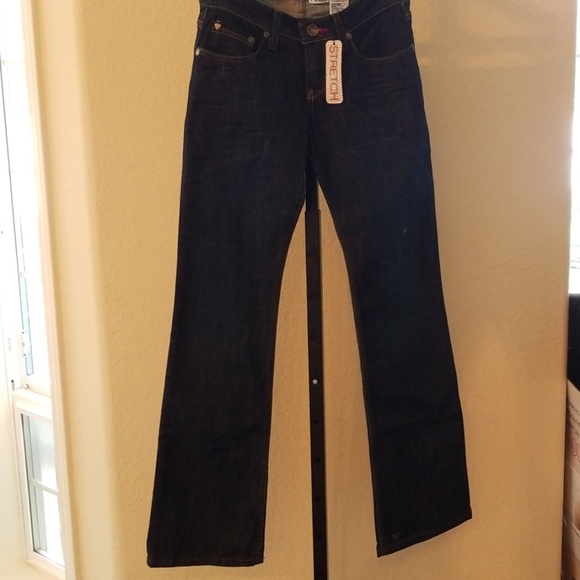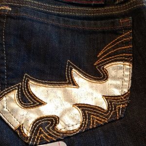 Dark wash. Silver screen print on back pockets. Not a heavy denim. Regular length.