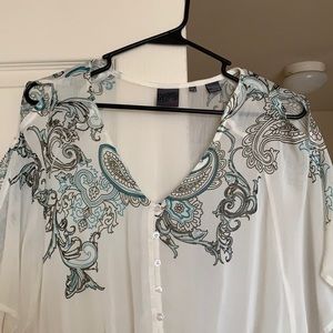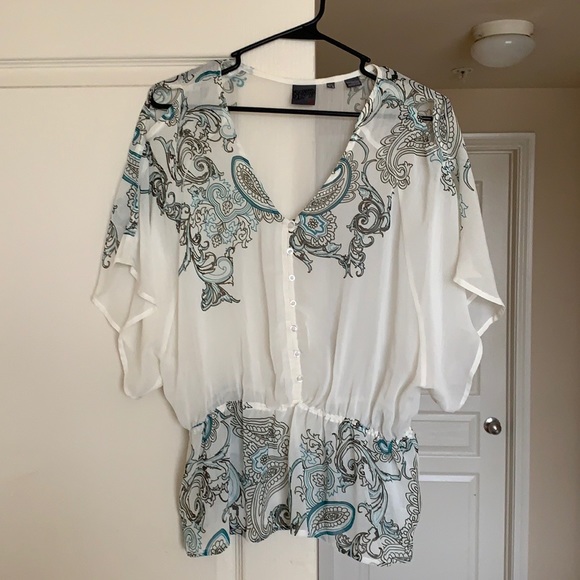 Sheer shirt, cute button detail, cut outs at shoulder and cinched waist.