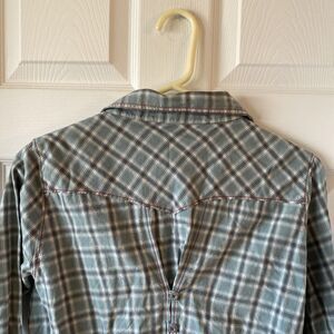 Embrace the Western vibe with the Southern Thread Women's XL Pearl Snap Button Up Long Sleeve Shirt. It features a timeless plaid pattern in a multicolor palette, a classic collared neckline, and convenient snap closures. The long sleeves with a fitted design offer a comfortable and flattering fit, perfect for any casual occasion.