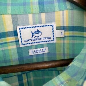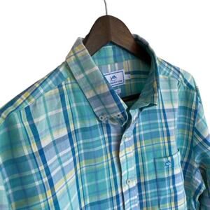 Southern Tide Blue and Green Plaid Button Down Linen Shirt - Large