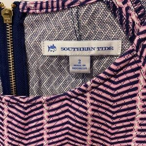 Size 2 Southern Tide fitted blouse in navy and pink chevron print with gold exposed zipper in back