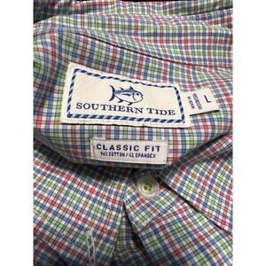 This is a Southern Tide Classic Fit button-up shirt for men in size L. It features a collared neckline, long sleeves, and a blue plaid pattern. Made of cotton blend fabric, it is lightweight, easy-care, and preshrunk. The shirt has embroidered accents, a pocket with a logo, and a button-down collar style. Suitable for travel, casual, and business occasions, it is a classic and colorful addition to a wardrobe.
