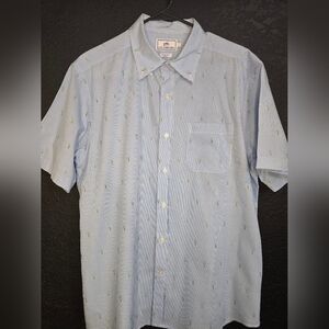 This men's button-up shirt by Southern Tide is crafted from blue cotton canvas material in a slim fit size Large. The shirt features a striped pattern with a colorful palm trees print, perfect for a casual or formal occasion. It has a collared neckline with a button-down style, short sleeves, and a front pocket for added functionality. The shirt is adorned with button accents and the Southern Tide logo, making it a stylish and vibrant addition to any wardrobe.