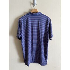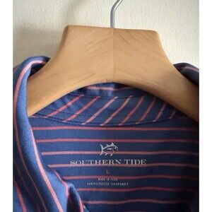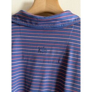 The Southern Tide Polo Shirt in Men's size Large features a blue and pink striped pattern, short sleeves, and a collared neckline. Made from a blend of polyester and spandex, this lightweight and breathable shirt is designed for performance activities like golf, tennis, and walking. The stretchy fabric ensures a comfortable fit, while the moisture-wicking properties keep you dry and comfortable during active movements. Perfect for business or casual occasions, this polo shirt from Southern Tide is a versatile and stylish addition to any man's wardrobe.