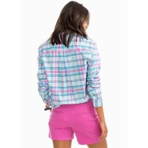 The fresh, pastel colors of this Southern Tide Stony Bay Plaid Hampton Shirt were styled after the bright new blooms of springtime on the islands. Washed for softness and drape. Shirttail hem. Buttons down the front. Skipjack embroidery at bottom left hem. Has blues, greens, and pinks in it. Cotton / spandex. Machine wash. In preowned condition.