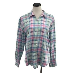 The fresh, pastel colors of this Southern Tide Stony Bay Plaid Hampton Shirt were styled after the bright new blooms of springtime on the islands. Washed for softness and drape. Shirttail hem. Buttons down the front. Skipjack embroidery at bottom left hem. Has blues, greens, and pinks in it. Cotton / spandex. Machine wash. In preowned condition.