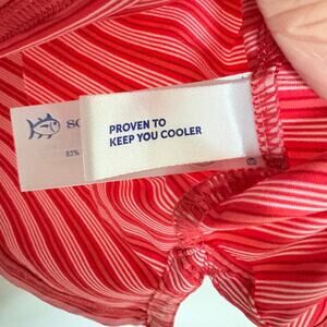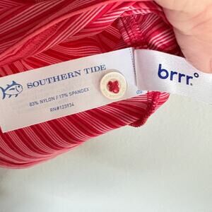 Southern Tide performance polo shirt with cooling brrr° technology. Red with tonal stripe pattern. Classic fit, button collar, short sleeve. 83% nylon, 17% spandex. Tag size XL.