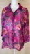 Southern Lady button up in purple, orange and black floral print. Is semi sheer, lightweight, flowy, 3/4 sleeve and very cute.