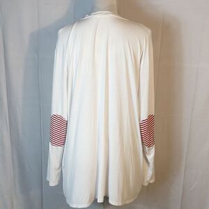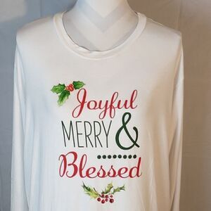 This white long sleeve Southern Stitch "Joyful Merry & Blessed Christmas tee is a size XXL with a pit to pit measuring 25" and a length of 30". There are red and white striped elbow patches. 95% cotton 5% spandex and machine washable. In excellent condition. All offers are welcome.
