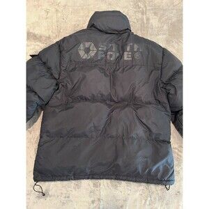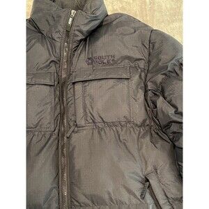 Introducing a rare vintage Southpole jacket for men in size XL. This black puffer coat features a solid pattern with quilted accents, a zipper closure, and the iconic Southpole logo. The outer shell is made of softshell nylon material with a nylon lining, and the insulation material is made of polyester.
