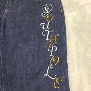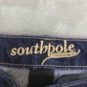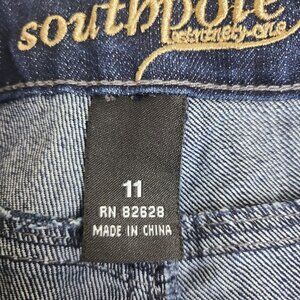 This Southpole Jeans is a women's size 11 in a dark wash blue denim fabric with embroidered accents. The jeans feature a low rise and a bootcut style, offering a comfortable and stretchy fit. Made from a blend of polyester, spandex, rayon, and cotton, these jeans also have a 5-pocket design for added functionality. The design incorporates hipster, festival, art, bohemian, college, city, 90s, hip hop, and logo themes, making it a versatile and trendy addition to any wardrobe.