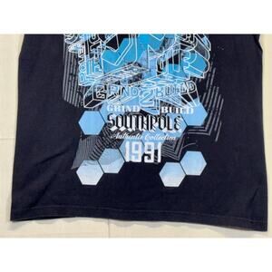 Bold and stylish Southpole men's graphic T-shirt in size XL. Features a striking front design with "GRIND 2 BUILD," "SOUTHPOLE," "Athletic Collection," and "1991" text layered over geometric shapes in blue and white. Made from a comfortable cotton blend, this black tee is perfect for streetwear enthusiasts and fans of urban fashion. Pre-owned and in good condition with no visible flaws. A standout piece for casual wear or layering.