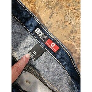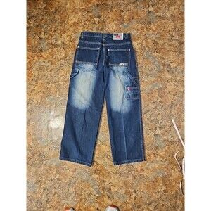 The Southpole RN82628 Y2K Baggy Jeans in size 18 feature a dark wash contrast stitch, giving them a unique vintage look. These wide-leg jeans have a high rise and are made of comfortable denim fabric with a relaxed fit. The jeans have a zip and button closure, 5-pocket design, and come in a solid blue color with embroidered logo accents. Perfect for any season, these jeans offer a stylish and comfortable option for teens looking to add a retro touch to their wardrobe.