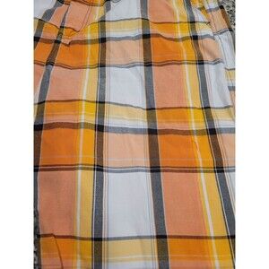 Features: Orange and yellow plaid pattern, flat front, belt loops, side hand pockets and a back pocket with interior white pocket lining