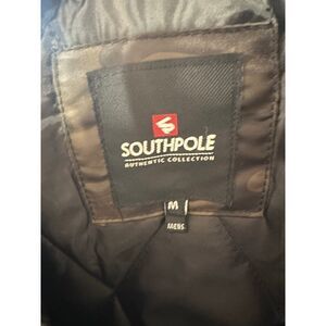 Jacket has zip up closure, 2 front slant, snap pockets, one arm sleeve zip closure pocket with slot pockets as well, and the south pole logo on the arm sleeve!