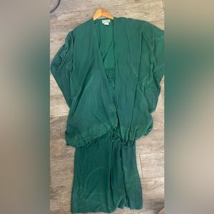 Emerald green with gold detail elastic waist skirt and fringe sarong-jacket style top. Size M (last photo is a similar pattern by the same company on how it looks on)